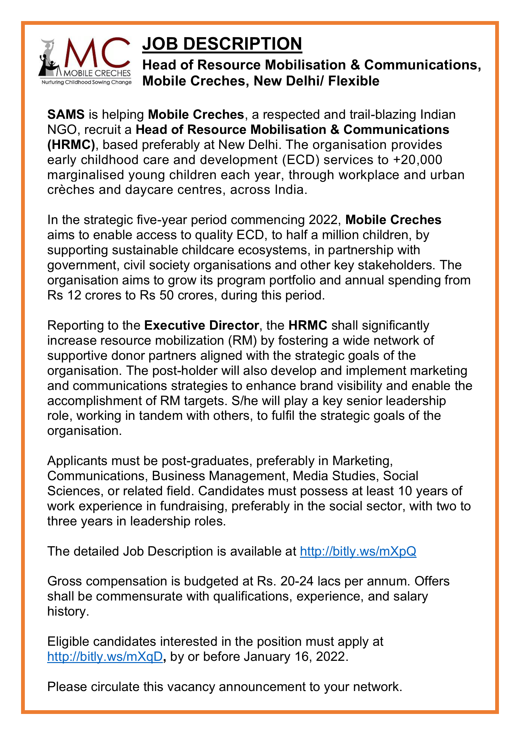 Sams On Twitter Vacancy For Head Of Resource Mobilisation Amp Comm Mobile Creches New Delhi Flexible Please View The Attachment And Visit Https T Co Z3sbbarrtd For Details Nonprofitjobs Fundraising Resourcemobilisation Marketing